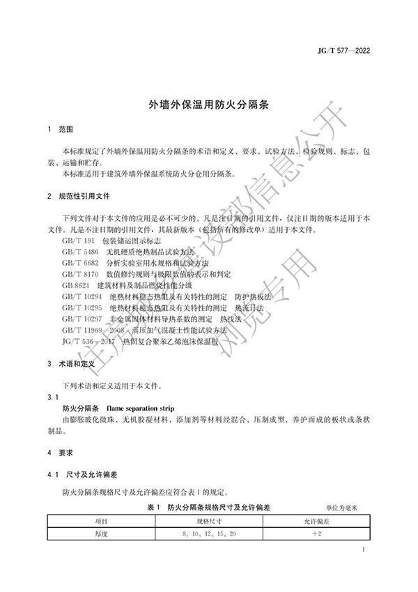 2022年3月25日,住建部發布行業標準《外墻外保溫用防火分隔條》,該標準為建筑工業行業產品標準,編號為JG/T577-2022,自2022年5月1日起實施。
